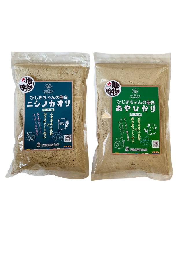 『ひじきちゃんの告白』は、三重県立明野高校生活教養科の生徒たちと地元企業が協力して開発した三重県産ひじき入り小麦粉です。三重県産小麦「ニシノカオリ」「あやひかり」を使用し、5%のひじきパウダーを配合。料理やお菓子作りに最適で、黒い色と独特の風味が特徴。いつものメニューにひじきをプラス。栄養豊富で色々なお料理をお楽しみいただけます。パッケージのQRコードからは、オリジナルレシピもご覧いただけます。